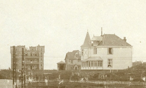Links het pompeuze ‘kasteel’ van Huis ter Duin en rechts de Villa Vera (die in WOII bij een brand is verwoest). Daartussen de Villa Seehorst, Dwars door het beeld de bovenleiding van de elektrische tram.