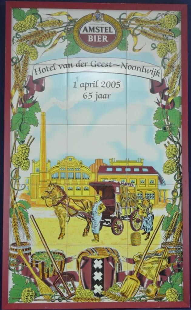 Het tegeltableau is te koop bij aardewerkfabriek ’t Delftsche Huys voor de somma van € 242.00. Het is een tegeltableau, gemaakt bij gelegenheid van het 65-jarig bestaan van “Hotel Van der Geest in Noordwijk” op 1 april 2005. Hotel Van der Geest in Noordwijk? 1 April 2005? Het zou om een 1 aprilgrap kunnen gaan, maar dan wel een vrij kostbare voor 242 pegels.
