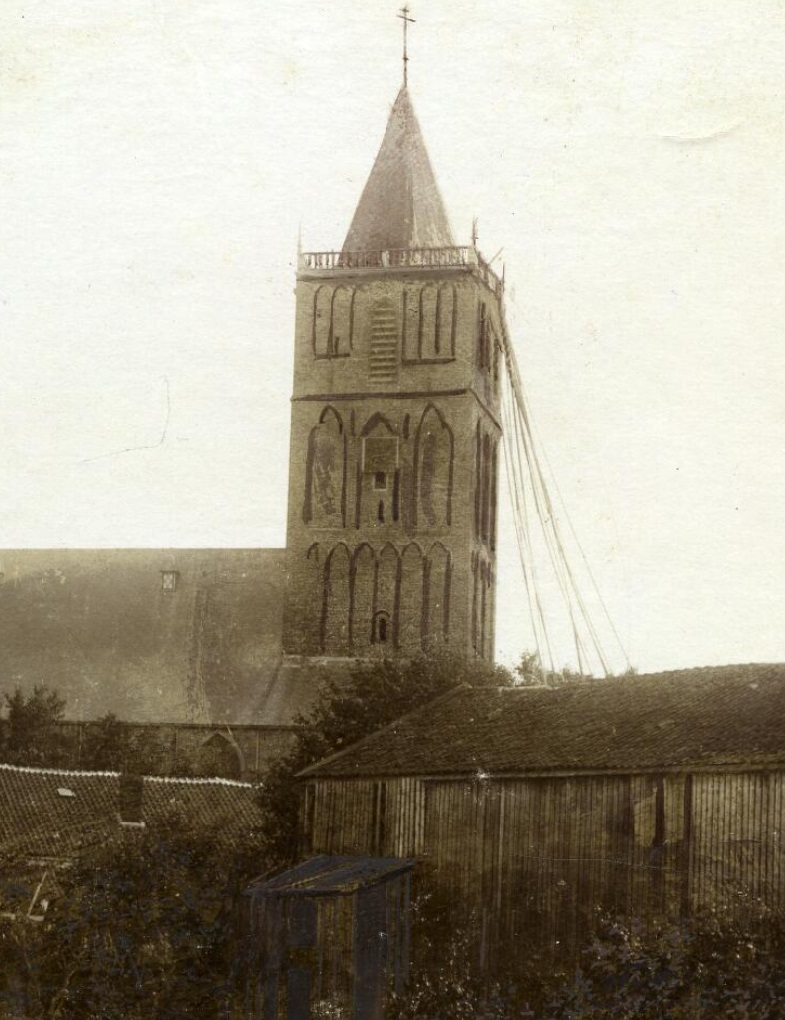 De foto’s had ik al eens eerder gezien. Ik vermoedde toen – bij gebrek aan beter – dat het hier om lange touwen ging die vanaf de toren hingen in het kader van het zgn. ‘torentrekken’ (Noordwijk Binders worden ook wel ‘Torentrekkers’ genoemd). Een soortement van folklore.