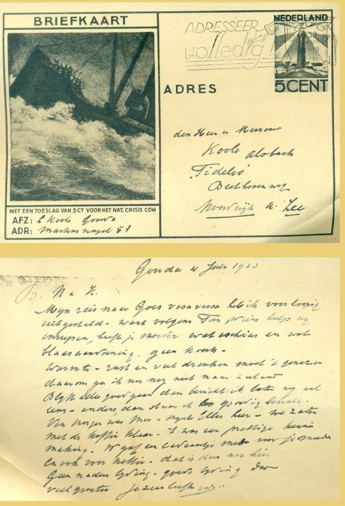 De mededelingen op de briefkaart betreffen weinig opzienbarends. Behalve dan de gedrukte tekst “met een toeslag van 5 cent voor het Nationaal Crisis Comité.” Dat Nationaal Crisis Comité was een Nederlandse instelling, opgericht in november 1931, die de door de crisis ontstane nood wilde lenigen. Het comité verstrekte goederen, afkomstig van de eigen industrie. Maar het comité was niet erg succesvol. Het beschikte over slechts beperkte middelen (de extra port zette blijkbaar weinig zoden aan de dijk) en het werd al in mei 1936 weer ontbonden. Ook een nationale collecte op zijn tijd leverde weinig op: