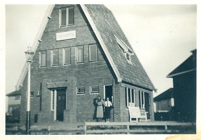 Ik krijg van Anneke – onder hartelijke dankzegging – bijgaande foto van “De Spits”, dat markante villaatje dat jarenlang fier naast de vuurtoren stond. De dames op de foto zijn, in witte bloes, de moeder van Anneke, Annie Appeldoorn. De dame ernaast is vermoedelijk de echtgenote van dokter Ten Kate uit Utrecht. Ten Kate had een huisartsenpraktijk in Utrecht en huurde (of bezat?) de Spits. Naast de grote vakantie ging zijn gezin er ook vaak in de weekends naar toe, alles onder het motto dat de buitenlucht (en dan vooral de zeelucht) belangrijk was voor een goed gezond.