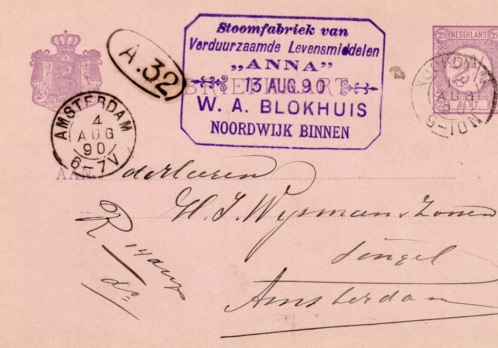 Wouter Blokhuis en zijn Stoomfabriek van Verduurzaamde Levensmiddelen “De Anna” is hier wel vaker langsgekomen. Maar niet dat prachtige stempel dat hij voor zijn post blijkbaar hanteerde. Hoe de datum op dat stempel (13 augustus 1890) zich verhoudt tot de datum op het poststempel (4 augustus 1890) weet ik niet.
