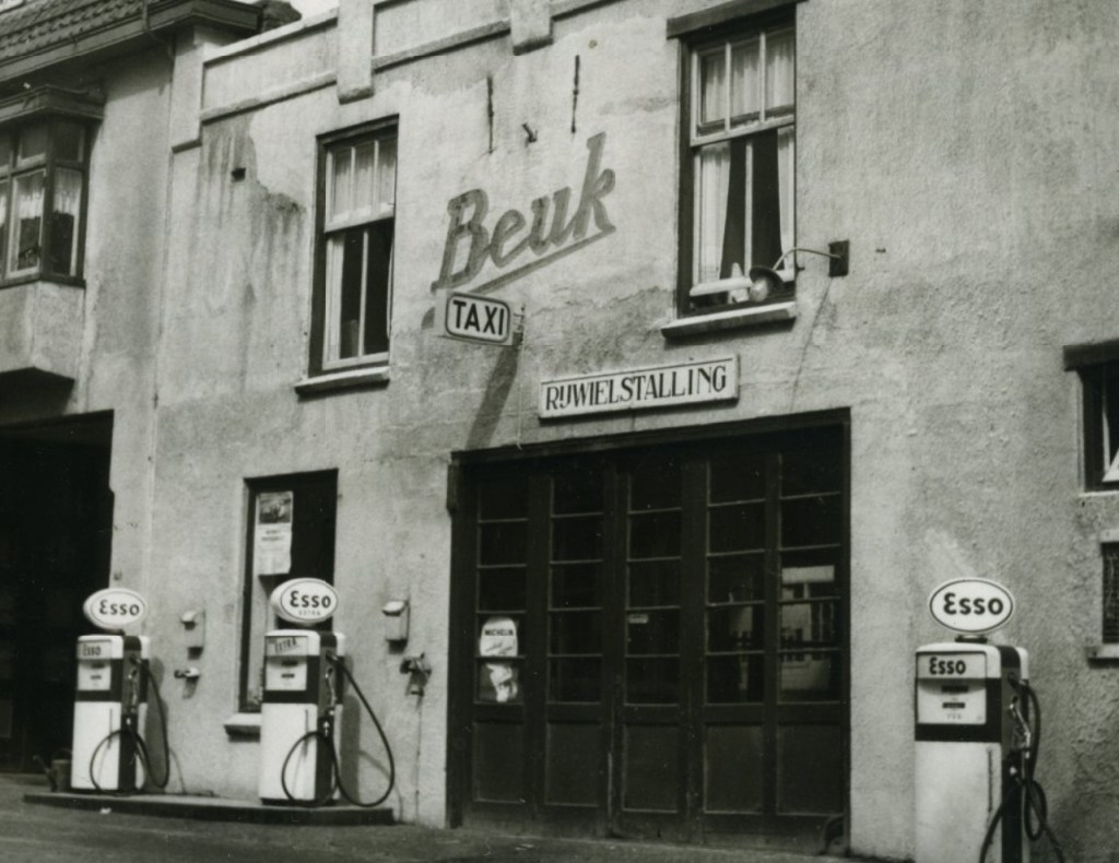 Als je hier alleen maar een rijwielstalling zou uitbaten, had je geen 3 benzinepompen nodig. Maar bij de garage van Beuk kwam ook wel eens een bus of een taxi aanzeilen door de smalle Jan Kroonsweg. De foto is van de nadagen van Beuk op deze plek, want veel onderhoud zat er niet meer aan. Alles zou tegen de vlakte gaan en plaatsmaken voor de Parallelboulevard.