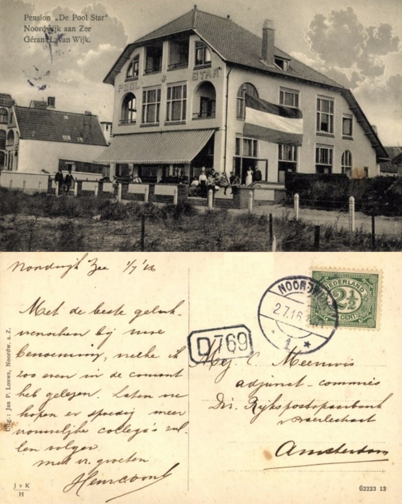 - Interessant is ook de naam die de kaart heeft uitgegeven. Op de achterkant wordt die aangeduid als ‘Jan P. Louws uit Noordwijk aan Zee’. Over deze Louws kan ik vrijwel niets terugvinden, helaas. Links onder staat nog enigszins cryptisch JvK, gedeeld door H. Hogere algebra, zou je denken, maar ik vermoed dat dat JvK terugslaat op Jan van Kan die volgens mij toen al (in 1916) overal in Noordwijk aan Zee aanwezig was en er o.a. een bazaar dreef.