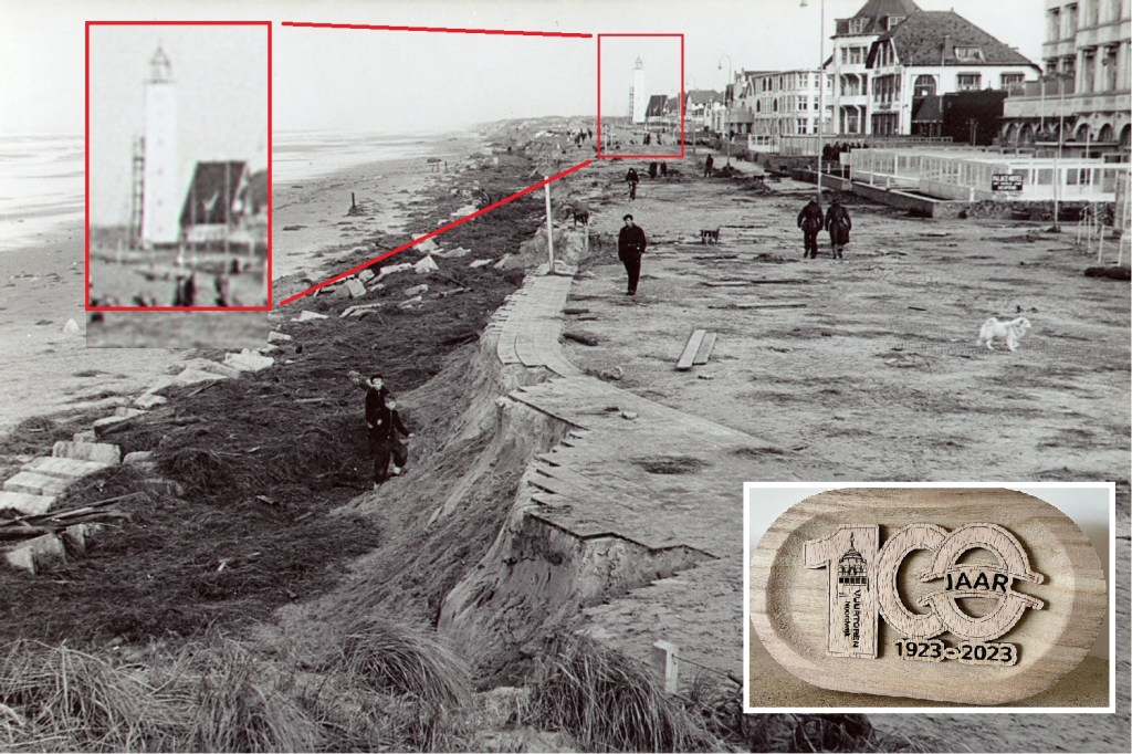 Dezer dagen herdenken we ook het 100 jarig bestaan van de Noordwijkse vuurtoren, een landmark bij uitstek. Ik pak beide momenten maar even samen (dat scheelt weer een blog), maar er is ook een verbinding tussen de twee gebeurtenissen: op de foto is te zien dat men in 1953 druk bezig was de erker halverwege de vuurtoren aan te brengen. De daartoe gebouwde steigers staan er ondanks het noodweer nog ferm bij.