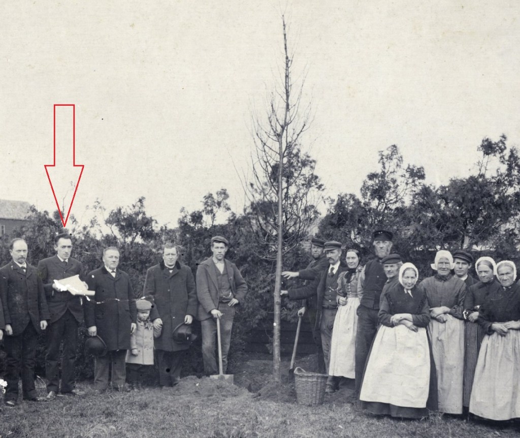 Ondanks de naarstige pogingen die men deed om het boompje rechtop te planten, moeten we constateren dat die pogingen faalden: de boom staat (of stond) een tikkie uit het lood. Onder de notabelen die bij het planten aanwezig waren, bevond zich ook de onvolprezen J. Kloos, warme bakker en dorpshistoricus (zie pijl). Zo te zien met een notitieblok in zijn hand: de geschiedenis van Noordwijk werd ter plekke geschreven.