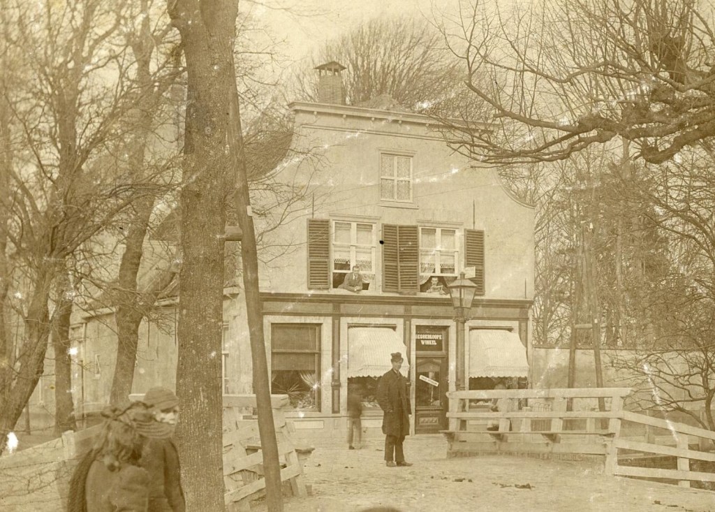We kijken richting de Oosteinderbrug, als één van de zgn. Heiligenbruggen ook wel Sint Pieterbrug genaamd. Recht vooruit, op de plaats waar later de rijwielzaak van Braakman kwam (Huize Rozenhof), zien we de winkel van mej. Taverne, hoedenmaakster. Later van de 3 gebroeders Jaspers, die samen een trio vormde: Jas, Broek en Vest. In WOI was hier een militair hospitaal. Boven de deurpost staat geschreven: ‘De Goedkoope Winkel’.
