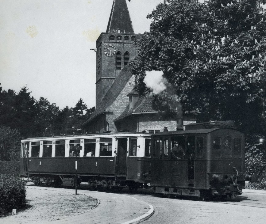 Gooise stoomlocomotief in Blaricum met als ‘aanhanger’ een zgn. MAN-rijtuig. Na opheffing van de Gooise Stoomtram werden de MAN-rijtuigen op verschillende manieren verkwanseld. Een groot deel ervan kwam in dienst bij de NZHTM en die rijtuigen werden ook als bijwagen bij de Blauwe Tram ingezet. Zo kon het zijn dat een rijtuig dat vaak heen en weer gespoord had tussen Blaricum en Hilversum opeens opdook op de lijn Noordwijk-Leiden, zij het dat de bruine kleur vervangen was door een blauwe.