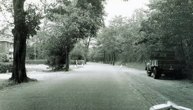 Oude foto van de Gooweg op de plek waar die nu gekruist wordt door twee ‘burgemeesterswegen’: de Van der Mortelstraat en de Van Berckelweg. Links de nog steeds bestaande villa ‘Tanah Wangi‘