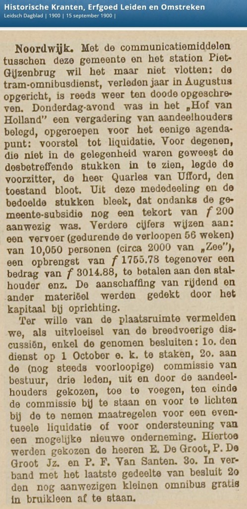 Zo kwam Derk Bolhuis als koetsier in dienst bij de door de VVV in 1899 opgerichte Maatschappij tot Exploitatie van een Paardenomnibusdienst Noordwijk aan Zee – Piet Gijzenbrug. Maar het initiatief was geen lang leven beschoren, getuige bovenstaand bericht in het Leidsch Dagblad van 15 september 1900. De hele dienst ging ter ziele, waarschijnlijk omdat de concurrentie met de stoomtram toch wat al te ambitieus en bewerkelijk was. Derk Bolhuis ging niettemin op private basis door met de dienst (hij kreeg de omnibus gratis in bruikleen), maar ook hij moest uiteindelijk eieren voor zijn geld kiezen.