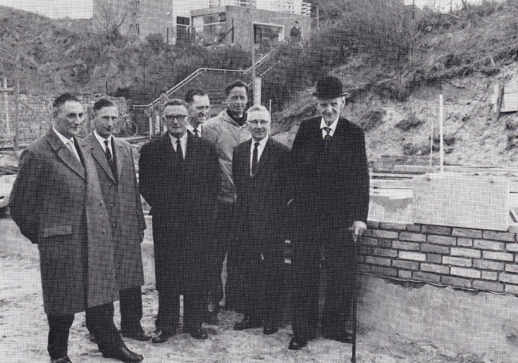 Cornelis – “Cees de Vurrever” of ook “de Sherlock” – Admiraal (Hzn) was naast eigenaar van een schildersbedrijf ook procuratiehouder bij de Bondsspaarbank. In 1962 was het hem vergund de eerste steen te leggen bij de bouw van het nieuwe bankfiliaal aan de Nieuwe Zeeweg. Hij kwam er niet mee op de foto, wel zijn zoon Henk, derde van links (foto’s met dank aan Jaap).