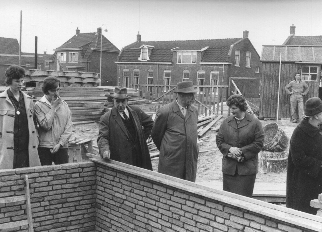 Mijn opa heeft die eerste steen gelegd. Daar heb ik een foto van. Rechts naast mijn ome Henk (van fotozaak Adfono) staat mijn ome Cees die de schilderszaak overnam. Daarnaast mijn tante Dit de echtgenote van ome Cees. En dan een gedeelte van mijn tante Klaar de echtgenote van ome Henk.