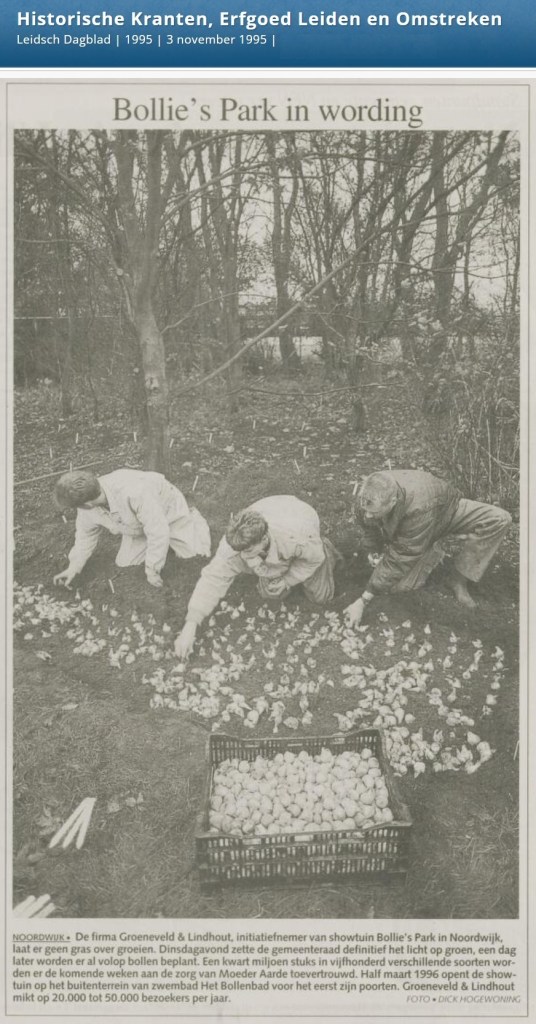 Op Marktplaats wordt een theelepeltje aangeboden voor 4 euro 25 van ‘Bollie’s Park’ in Noordwijk. ‘Bollie’s Park?’ Ik moet iets hebben gemist, Maar op de site van Erfgoed Leiden wordt het geheim onthuld. Bollie’s Park was een showtuin met een kwart miljoen bollen van 500 verschillende soorten. Op het buitenterrein van het Bollenbad aan de Nieuwe Zeeweg. Een initiatief van de firma Groeneveld en Lindhout. Men mikte op 20 tot 50.000 bezoekers per jaar. Eind november gingen de bollen de grond in. En toen.