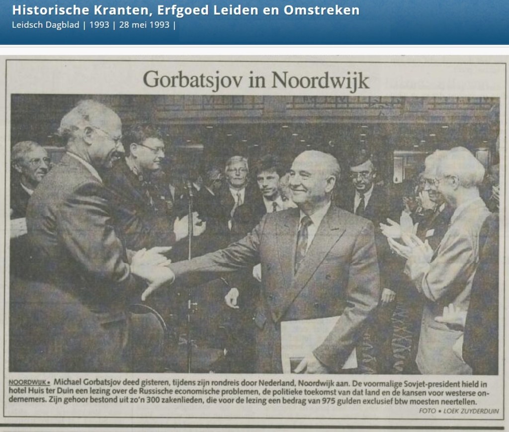 Michail Sergejevitsj Gorbatsjov (Михаил Сергеевич Горбачёв) bracht 2 jaar na zijn aftreden als president van de Sovjet Unie een bezoek aan Noordwijk, waar hij blijkens het Leidsch Dagblad voor € 292.500 (300 x € 975) oreerde over de economische problemen van Rusland, over de politieke toekomst van dat land en over de kansen voor westerse ondernemers. Benieuwd wat hij in dat opzicht allemaal te vertellen had, maar ik veronderstel dat hij de huidige situatie toch niet voorspeld zal hebben.