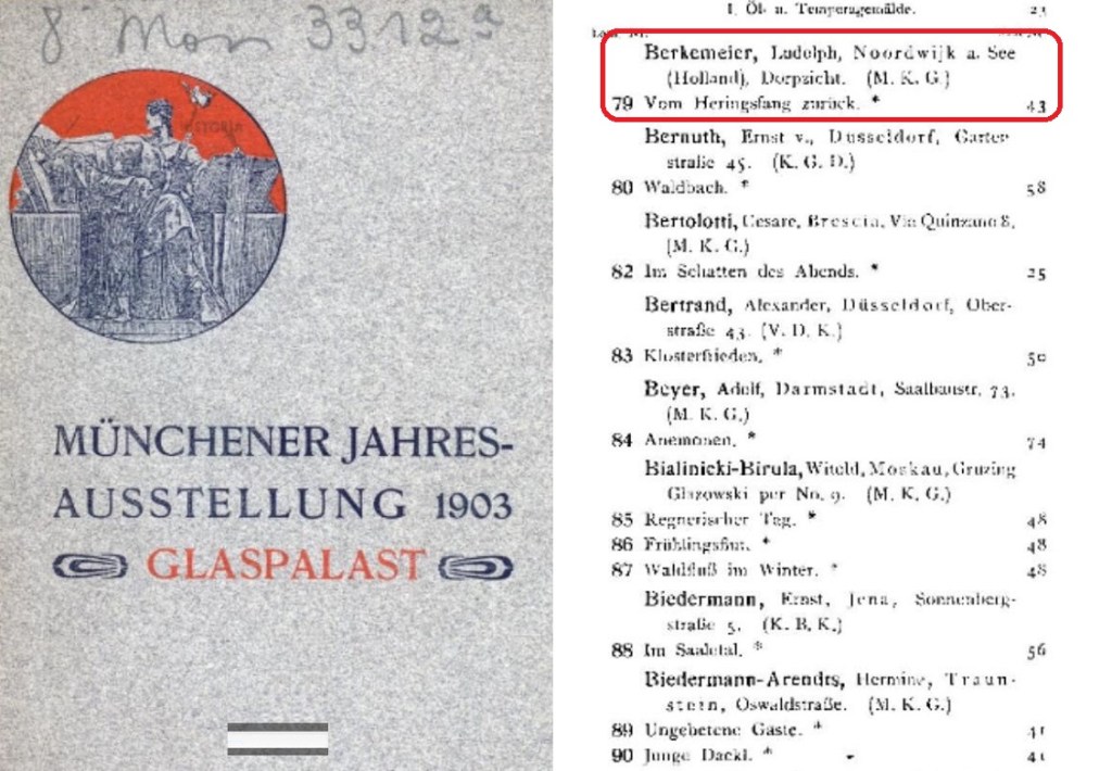 Met het oog op de komende tentoonstelling van Noordwijkse werken van de schilders Berkemeier en Wijsmuller (in Museum Noordwijk: gaat dat zien!!) deze lichtdruk uit de catalogus van de Münchener Jahresausstellung 1903 in het Glaspalast aldaar: inzending 79: Vom Heringsfang zurück van Ludolph Berkemeier, woonachtig in Huis Dorpzicht in Noordwijk aan Zee.