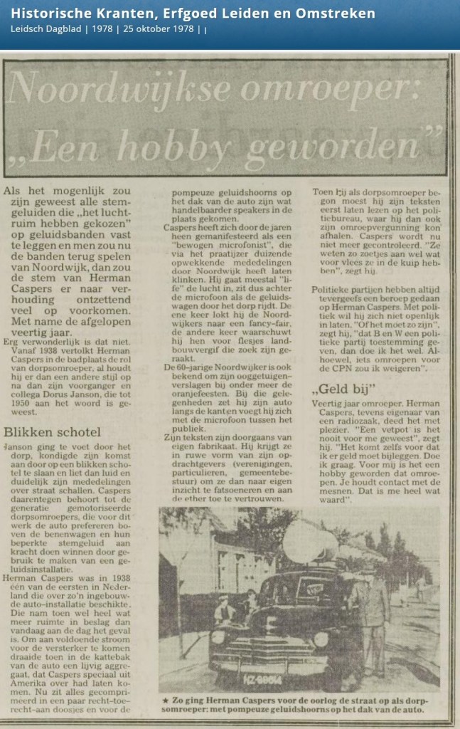 In het Leidsch Dagblad van 25 oktober 1978 verscheen een portretje van Herman Caspers, dorpsomroeper bij uitstek en waardig opvolger van Dorus Mol. Fijne vent. Hij reed bij verschillende gelegenheden met zijn auto, behangen met luidsprekers, langzaam door het dorp om de burgers kond te doen van deze of gene boodschap. In de ene hand een microfoon, in de ander, die lichtjes aan het stuur hing, een mooie bolknak, want Herman hield wel van een mooie sigaar.