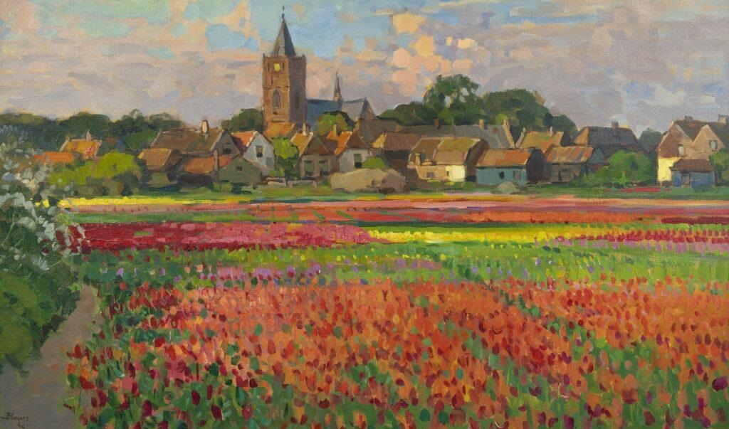 Mooi schilderij van Ben Viegers (1886-1947): “Bloeiende Bollenvelden bij Noordwijk”. Het schilderij is te koop bij Galerie Mark Smit. Viegers was een Hagenees, die rond de oorlog eclipseerde naar het oosten des lands. Bij het schilderen van dit beeld moet hij ergens aan het Sluispad hebben gezeten, schat ik zo in. En hij wist het bij die gelegenheid ook zo te draaien dattie de kattelieke kerk wist te vermijden. Misschien expres: twee kerken zouden in dit geval de bloembollenvelden geweld hebben aangedaan.