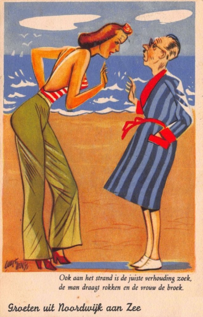 Toen was er nog humor…de bewustzijn stroom was in die tijden nog bevattelijk en simpel…in England waren deze cards een hype en een type card heeft een schare verzamelaars onder andere de uitgevers de onderwerpen en de tekenaars Miller en Mcgill …velen anderen …Donald mc Gill maakte het zo bont dat die in yail belande en 75 pond boete kreeg over een kaart waar men een corner speaker aan een dame een pond vraagt….was een schok en de hype storten in en vele kleine verzamelaars sloten…drs p van de wolven song was ook een groot verzamelaar…mc Gill was de eerste in dit genre is een museum opgericht er werden 200 milj cards verkocht de man stierf in armoede …hij had geen royalties…de eerste kaart maakte die in 1904 voor een ziek neefje…maakte 12000 onderwerpen…later toen men ook in England wat losser ging denken en praten werd het werelds weer een hype in de fifties en sixties waren langs alle Europese kusten de kaarten van mcgill te koop…saucy cards noemde de crowd het…wellicht zijn er boeken van…mooie verhandeling deze interieur monoloog…gisteren bij wie van de drie wist ik de naam van de kermisbank namelijk miami trip…mn hobby is kermis…we werden gefopt…all in the game…in terug naar oestgeest staan in de film nog tenten linnen hout uit noordwijk…het was 40 jaar terug prettig werken met de bekende regisseur…so long…op strand verkochten we ook deze saucy cards…een bekende thrill en spills is de card dat mcgill vraagt aan een vrouw lezend onder een boom…houd uw van kipling….