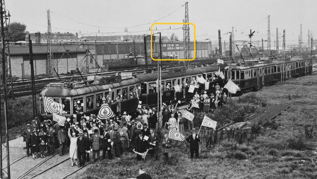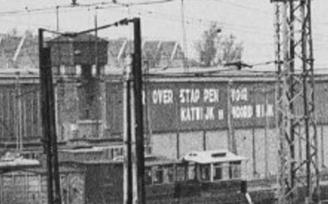 De tekst op de remise is goed zichtbaar vanuit een langsrijdende trein. Dat overstappen moet dus wel slaan op treinreizigers die naar Noordwijk of Katwijk willen en dus verder moesten met de tram.