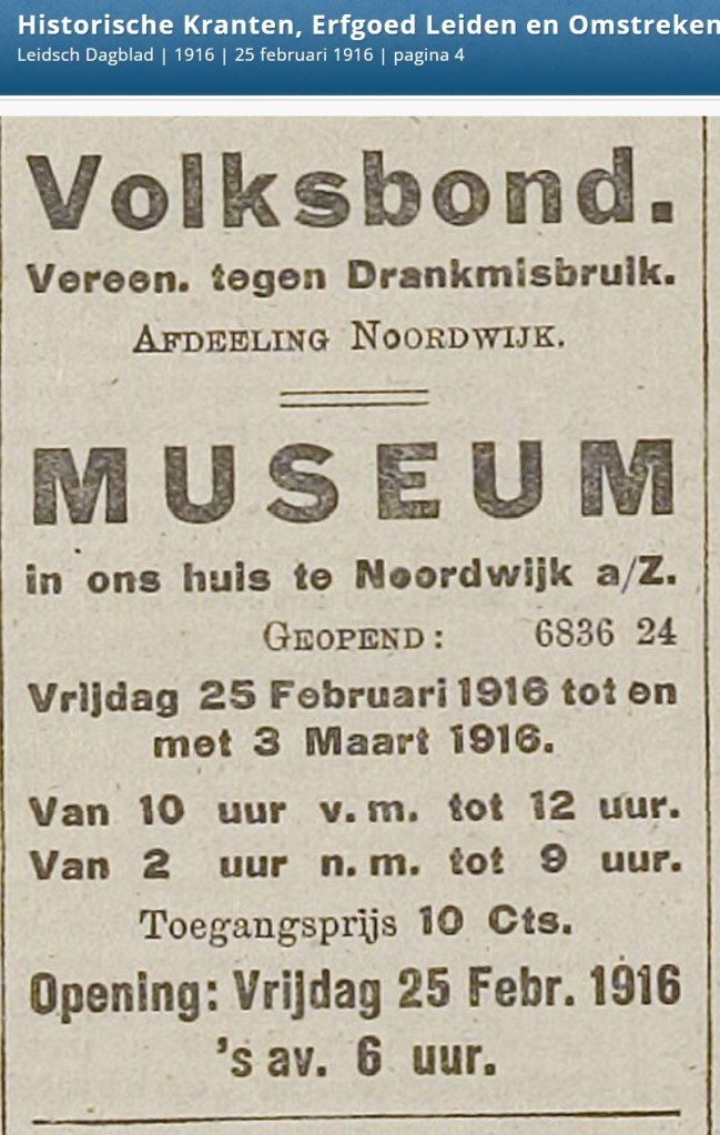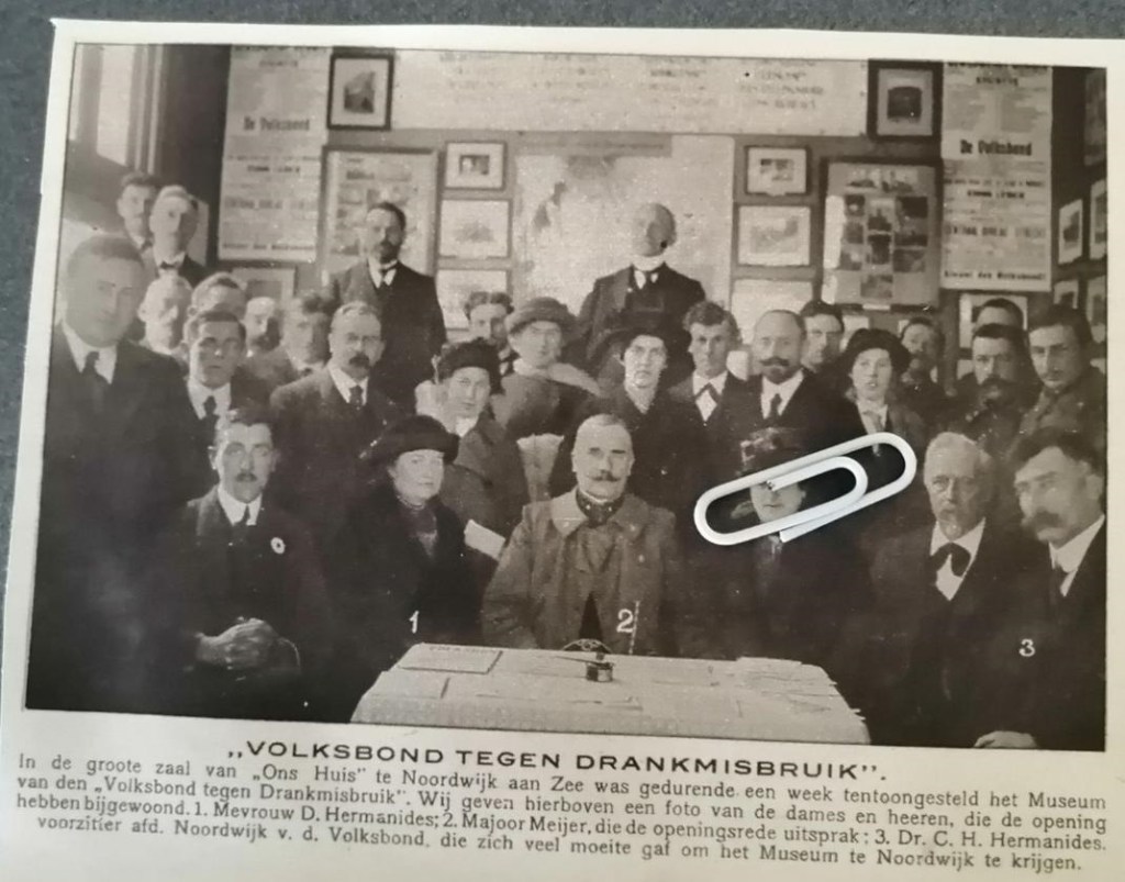 Op 25 februari 1916 kreeg de Bond nog eens een extra push met het “Museum van den Volksbond tegen Drankmisbruik”, een soortement van pop-up museum dat tijdelijk onderdak vond in “Ons Huis”. De officiële opening vond plaats door ene Weledelgestrenge Majoor Meijer, schijnbaar een hotepetoterige propagandist van de Bond. Bovenstaande foto werd bij die gelegenheid gemaakt.