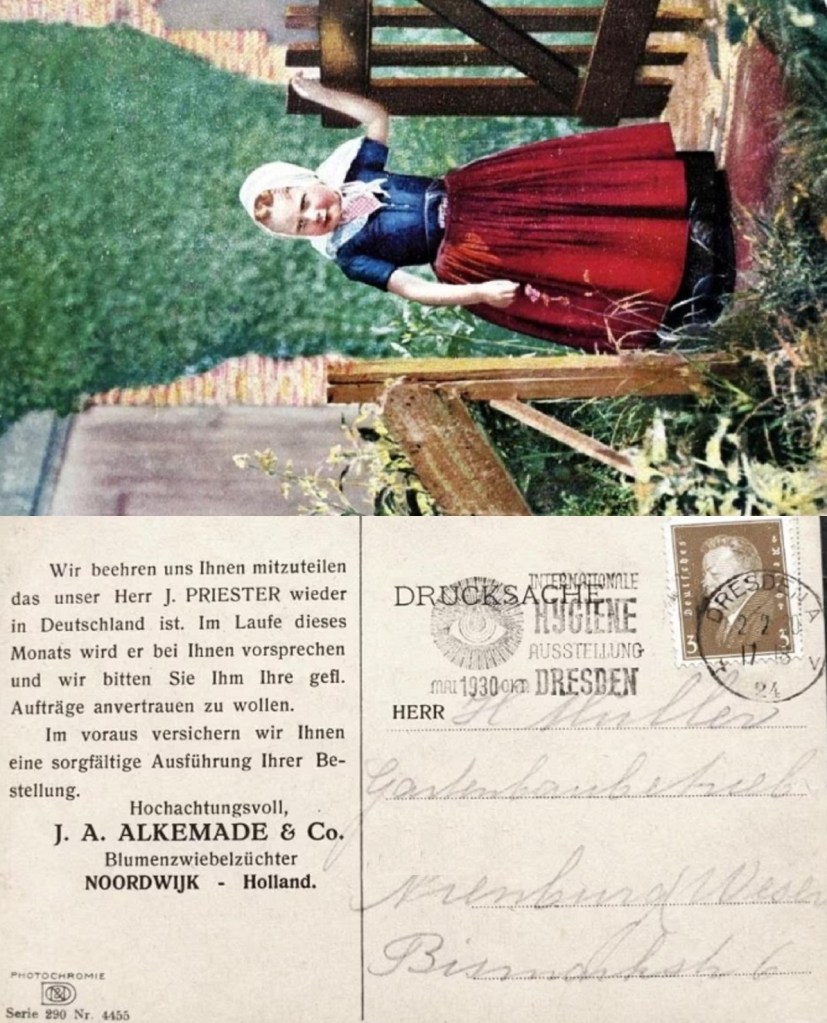J.A. (‘Jan’) Alkemade uit Noordwijk werkte vanuit Dresden als importeur van bloembollen. Hij was een zoon van Arie Alkemade en een kleinzoon van Jan – ‘De Duitser – Alkemade en ‘Gouwe Ka’ Dobbe. Vader en opa Alkemade waren beiden exporteurs van bloembollen, Jan Jr. zat daar in Dresden dus aan het andere end van de lijn. Hij had voor de verdere distributie van de bloembollen in Duitsland een reiziger nodig die allerhande tuincentra bezocht om de handel uit Noordwijk te slijten. Dat was ene J. Priester. De aankondiging van diens komst ging hem per post vooruit.