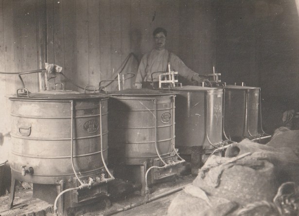 Mijn grootvader, Piet Slats, kwam na de mobilisatie van 1914-1918 te werken bij S.A. (‘Siem’) van Konijnenburg, alwaar hij het nog zou schoppen tot schuurbaas in het complex aan de Schiestraat. Hier is tie – schat ik zo in – bezig nog als gewoon ‘knecht’ met het koken van de narcissen (ik geloof dat ze dat met narcissen deden). Dat ‘koken’ behelsde niet zomaar de boel laten pruttelen in een vat met schoon water, maar de boel flink laten stomen in een vat vol vergif. Daar waren die bollenboeren van toen (nog steeds?) niet vies van.
