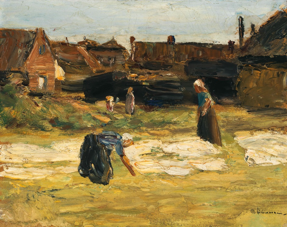 Het schilderij is getiteld ‘Dorpswinkel met Bleekveld’ en het is van de hand van de onvermijdelijke Max Liebermann. Op de achterkant van het werk staat met de hand geschreven: “Max Liebermann, aus seiner Holländischen Zeit, 80er Jahre”. Door de veilingmeester van Veiling Dorotheum in Wenen wordt dit schilderij echter niet in de tachtiger jaren van de 19e eeuw gesitueerd, maar in 1905. En dat maakt dat dit beeld zeer wel in Noordwijk geschilderd kan zijn, want Liebermann kwam in de zomer van 1905 voor het eerst in Noordwijk.