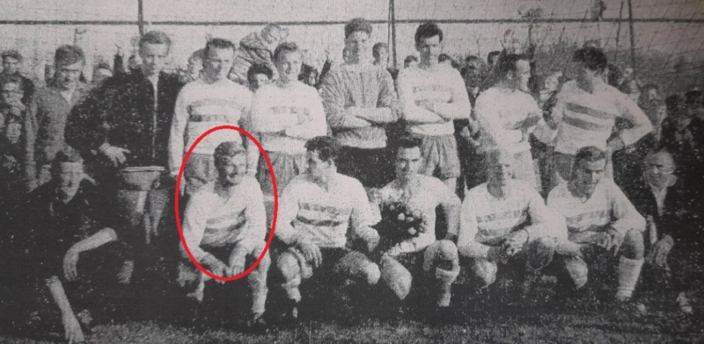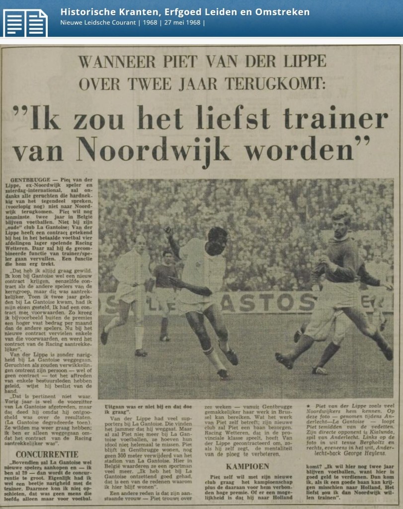 Bovenstaand krantenartikel dateert uit de tijd van La Gantoise. Hij meldt daarin dat hij binnen afzienbare tijd wel naar Nederland terug zou komen en bij voorkeur trainer zou willen worden van de vv Noordwijk. Daar is het jammer genoeg nooit meer van gekomen. Piet zou altijd in België blijven wonen, waar hij begin 2022 gestorven is. Mooie man, die ‘Brink’. Op onderstaande foto poseert hij nog in dat schitterende Noordwijk-shirt samen met o.a. zijn maten Kees – “De Kikker” – Marijt, Dick – “De Rous”- Heemskerk, Jaap – “De Nijd” – van der Niet, Jan – “De Sik”- Haasnoot, Jan – “De Tulp”- van Duin, Jaap – “De Vlieg” – van der Meulen, Gerard – “De Grad” – Passchier en Arend – “De Ster” – van der Wiel.