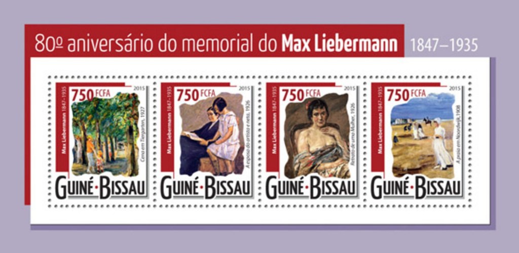 Je gelooft het pas als je het ziet: in Guiné-Bissau werd nog in 2015 deze postzegel uitgegeven met een schilderij erop van Max Liebermann. “A Praia em Noordwijk 1908” staat er ook nog op in een mij vreemde taal. Ik vertaal het gemakshalve maar met ‘Strand van Noordwijk in 1908’.
