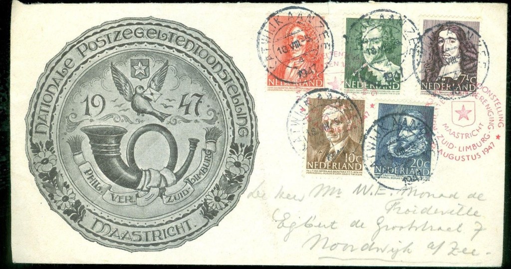 De envelop wás al een keer gestempeld, namelijk via de nationale postzegeltentoonstelling van Maastricht van 1947. Een soortement van pre-AMPHILEX. Maar iemand meende de envelop te kunnen doorsturen vanuit Katwijk naar ene heer mr. W.E. Monod de Froideville in de Egbert de Grootstraat nommer 7 in Noordwijk. Daar had hij of zij buiten de waard – in dit geval een overijverige Katwijkse postbeambte – gerekend. Die zette er nog eens een paar viezige stempel overheen, hetgeen de betekenis en de waarde van de envelop eigenlijk te niet deed.