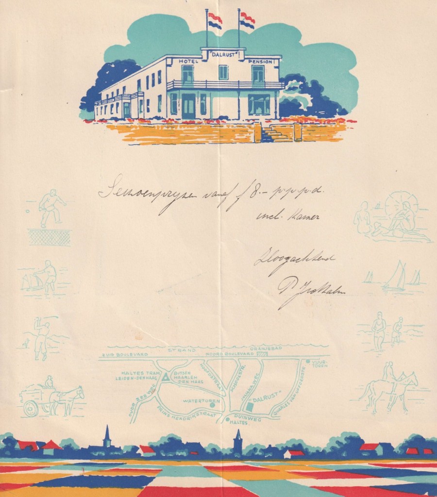 Dit schitterende briefpapier is wel eens eerder langs geweest, maar omdat het zo mooi is, nóg een keer. Voordat Huize Dalrust een verzorgingstehuis werd, was het een pension (ook een soort van verzorgingstehuis). En daarvoor was het ‘Pension Johanna’. Illustere personen verbleven er: Albert Verweij bracht er vaak gasten onder (zijn schoonzus en zwager Martha van Vloten en Frederik van Eeden logeerden er regelmatig. Maar ook oud-burgemeester van Amsterdam, Gijs van Hall. Hij studeerde in de Jaren Twintig van de vorige eeuw rechten in Leiden en had met menig vak moeite. Bottleneck was het strafrecht. ‘Daarmee heb ik de grootste moeite,’ schreef hij Emma. Hij deed bij haar zijn beklag over dit vak, dat hem ‘voorlopig nog te wijsgerig’ was. ‘En daar is mijn geest niet beschouwend genoeg voor en vooral: daar heb ik geen geduld voor.’ Om ‘veel minder afgeleid te worden’ besloot hij een kamer te huren in pension Dalrust in Noordwijk. Daar zou hij dan – geheel verzorgd – zijn studie kunnen afronden en af en toe ook nog eens een golfbal kunnen slaan. Het studeren ging in Noordwijk inderdaad ‘veel beter dan in Leiden, d.w.z. het dringt beter tot mij door’ (Uit: Dirk Wolthekker: “Alleen omdat ik een Van Hall ben : Gijs van Hall 1904-1977”).