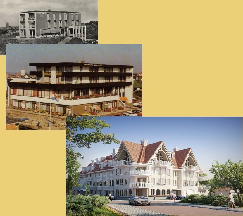 In 1932 leren Piet van der Zalm en Willy van den Berg elkaar kennen. Piet een zoon van een bollenboer en Willy de dochter van de kruidenier. Ze trouwen in 1934 en krijgen 7 zoons. Terwijl Piet op het land werkte, “t Weitje” bij Offem, daar waar nu de Hoffennepark is, begint Willy een hotel. Ze heeft altijd in de hotellerie gezeten. Jaren draaide ze pension Dalrust. Daar zijn de 2 jongste zoons Ton en Jan geboren. Wil is geboren op de Rembrandweg in huize “De Panne”. In 1952 laten ze Hotel Zeezicht bouwen met 19 hotelkamers, boven op een duintop aan de toen nog Pickéweg 20. Het gezin Van der Zalm woont in de kelder. Daar was het aangenaam warm in de winter. De storm van 1953 blaast het hele dak van het hotel af. Regelmatig wordt er aan het hotel verbouwd of aangebouwd. In 1961 is het gebouw wederom vernieuwd. “Een rustig familiehotel – schitterende omgeving – warm en koud stromend water – centrale verwarming…”