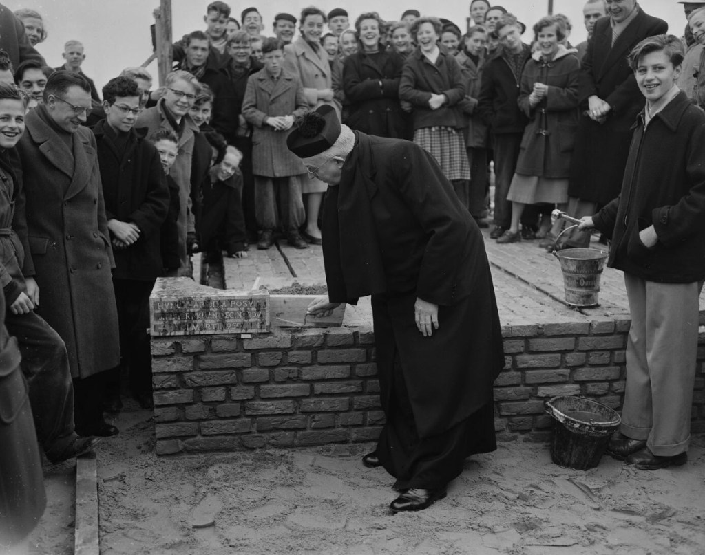 Op 31 maart 1955 legde toenmalig Deken J.P.A. Brinkman de ‘eerste’ steen van de RK Mulo St. Willibrord aan de van Panhuysstraat. Ter rechterzijde staat al iemand te wachten met het wijwatervat en bijbehorende kwast: de steen moest uiteraard gezegend worden.