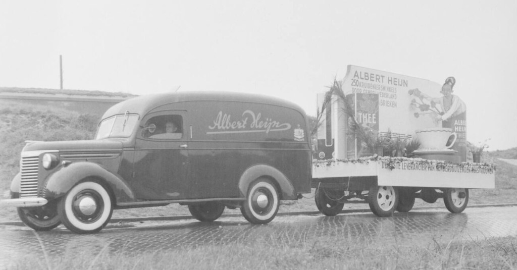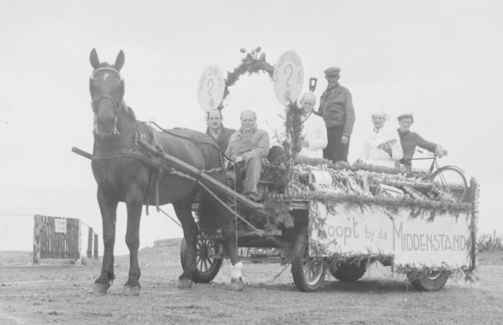 In de lange stoet van (praal-) wagens tijdens het bloemencorso van 1948 reed ook deze paardenbrik mee. Die riep op vooral te kopen bij de plaatselijke middenstand: de slager, de bakker en de groentenboer. Iets verderop in de stoet reed een ander ‘paard’ mee, ditmaal een ‘Paard van Troje’: Albert Heijn had zich ook een plek weten te verschaffen in de stoet en dat had al een veeg teken aan de wand kunnen zijn. Jaren later zou een groot deel van diezelfde middenstand van toen vrijwel geheel weggevaagd worden door diezelfde Albert Heijn.