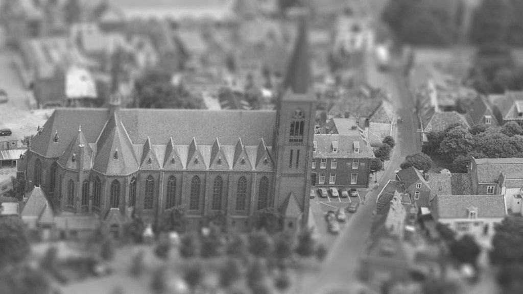 We kunnen de foto ook ‘tiltshiften’, met andere woorden: van de kerk een miniatuuruitgave maken: