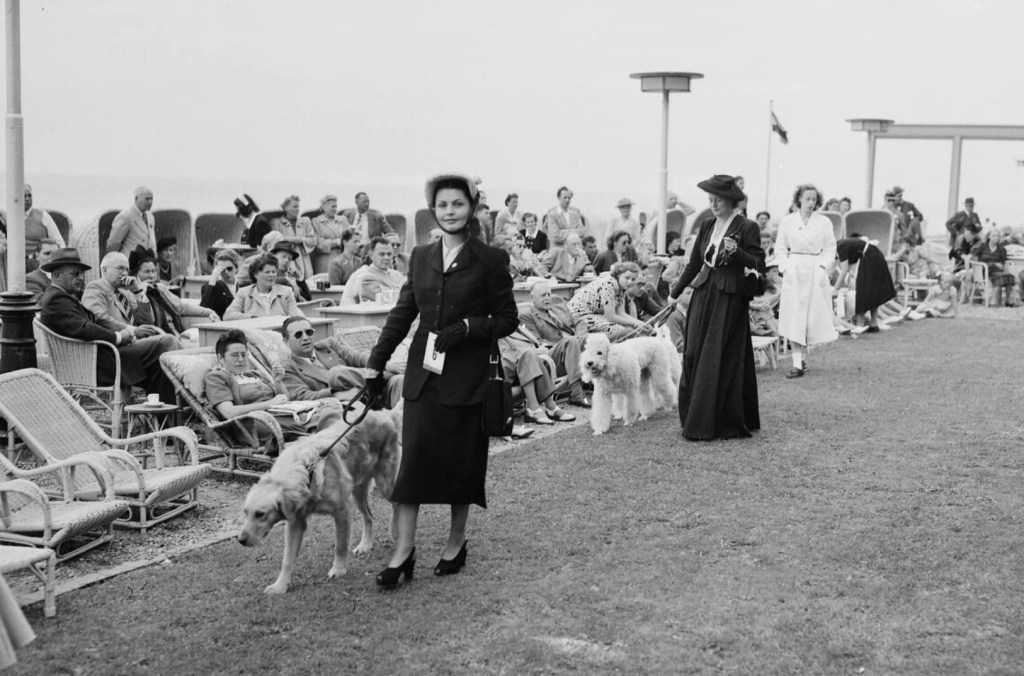In de zomer van 1948 werd in en om Huis ter Duin een grote hondenshow georganiseerd. Hier paraderen enkele van deze viervoeters langs een kritisch publiek op het terras van Huis ter Duin. Het publiek zag er zo kort na de oorlog al weer redelijk doorvoed uit. De honden waren nog wat aan de magere kant.