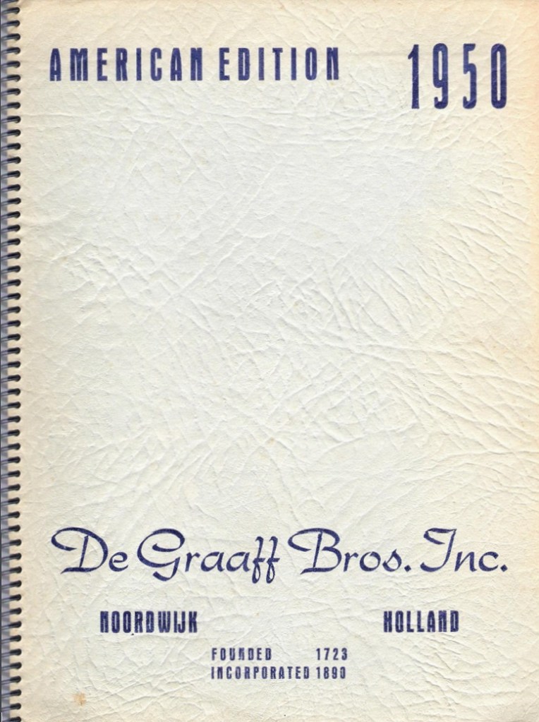 Amerikaanse catalogus uit 1950 van De Graaff Bros. Inc. uit Noordwijk. Ik heb het allemaal wel eens eerder proberen te ontrafelen, maar zonder succes. Feit is dat De Graaf Bross op enig moment is samengegaan met S.A. (Siem) van Konijnenburg, waarna beiden zijn opgegaan in de NV Verenigde Culturen. Alles aan de Schiestraat in Noordwijk Binnen. Zeker is dat Siem Konijnenburg getrouwd was met Bertha de Graaff en dat zij en die hele De Graaff-clan oorspronkelijk uit Lisse stammen. Misschien dat dat huwelijk tussen Siem en Bertha de aanleiding was om de boel samen te voegen, maar dat gebeurde volgens mij al eerder dan het jaar 1950, van waaruit deze catalogus stamt.