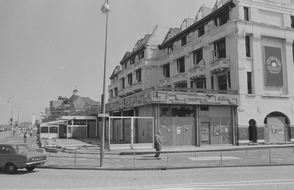 De teloorgang van het aloude Noordwijkse hotelwezen treffend in beeld gebracht. Twee beeldbepalende gebouwen, het Palace Hotel en het Huis ter Zee, zijn al flink aangetast en zullen kort daarna naar de Philistijnen geloodst worden. Of het gebouw links van Huis ter Zee ook een naam had, weet ik niet. Het hoorde wel bij Huis ter Duin, maar ging mét Huis ter Zee te loor.