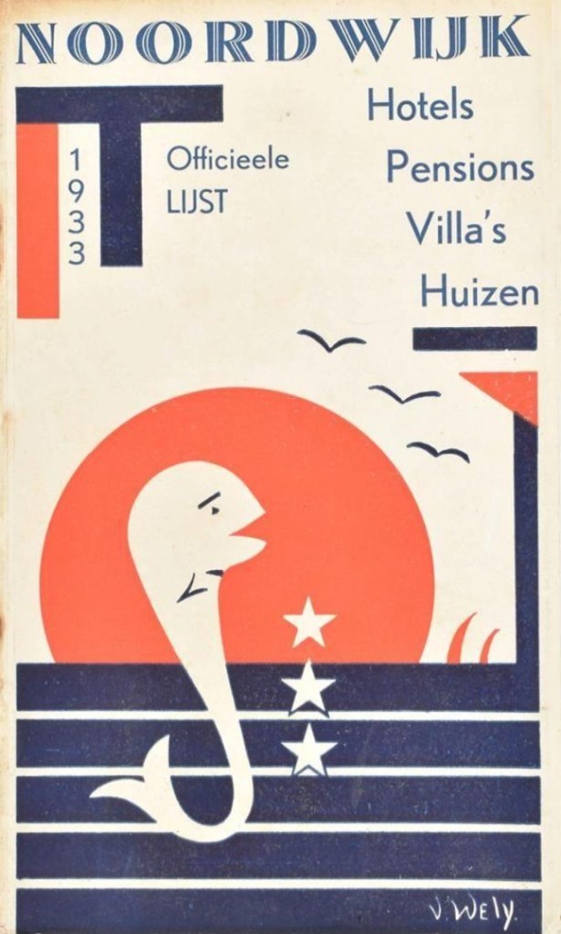 De lokale VVV van Noordwijk gaf in 1933 deze officiële lijst uit van ‘hotels, pensions, villa’s en huizen’ in Noordwijk. Op de cover prijkte het wat iele visje dat ooit door Rudolph Tappenbeck als een soortement symbool voor Noordwijk was ontworpen. Maar de cover als geheel was blijkbaar een ontwerp van Van Wely, een ondernemer die ook buiten zijn eigen toko actief was in Noordwijk, in de VVV, bij de bloemenfeesten, etc. Hij kon overal chocola van maken.