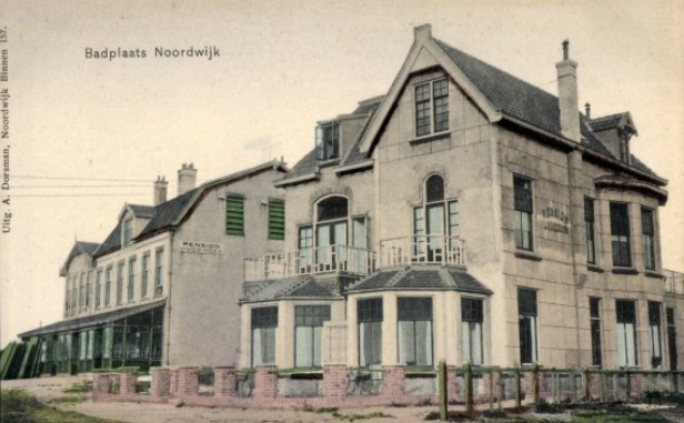 De prachtige villa te rechterzijde van Pension Hoek was “Laagduin”. Volgens mijn ook al gebouwd door de ondernemende ondernemer Hugo Hoek. We hadden die villa al eerder te pakken. In deze versie heeft iemand op amechtige wijze gepoogd de foto in te kleuren, wat maar ten dele is gelukt.