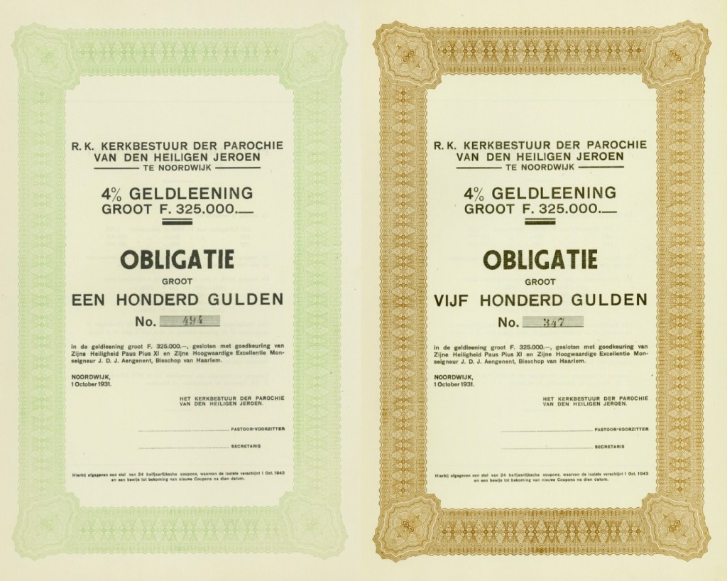 Het kerkbestuur van de parochie Sint Jeroen zat in 1931 blijkbaar om een paar centen verlegen. Die kwamen niet aanwaaien van Zijne Heiligheid uit Rome, noch van Zijne Excellentie uit Haarlem. Vandaar dat er een aantal obligaties werd uitgeschreven, waarop men kon intekenen. Het stond protestanten ongetwijfeld vrij om ook in te tekenen, vermoed ik. Gelet op de glorieuze tijden – toen – van het Rijke Roomsche Leven zullen ze dat waarschijnlijk wel gedaan hebben. Hoe obligaat dat vanuit hun denominatie ook was.
