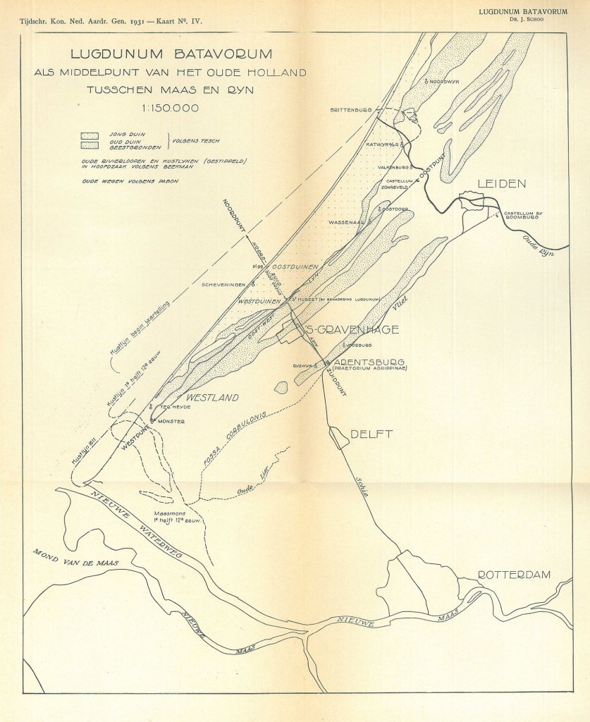Op deze kaart is goed te zien dat de oude kustlijn van Nederland vanaf Noordwijk naar beneden een stuk verder uitliep. Ook te zien enkele oude Romeinse vestingen, zoals Brittenburg, het Castellum bij Roomburg en Arentsburg bij Praetorium Agrippinae (Voorburg). En ook is te zien dat de Oude Rijn de limes vormde, de noordgrens van de Romeinse beschaving. Noordwijk viel toe aan een andere – naar ik vrees wat minder beschaafde – beschaving.
