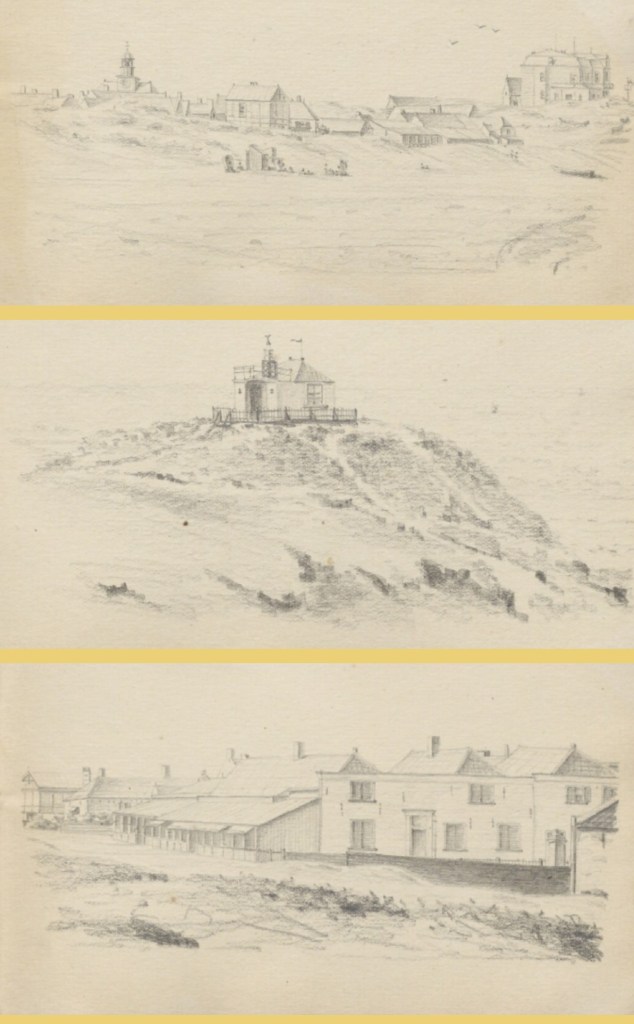 Drie tekeningen van ene Theodoor Scharten, gemaakt in juli 1894. Over Scharten zelf kan ik niet zo veel nadere info vinden helaas. De tekeningen zijn voor een beetje in de geschiedenis thuiszijnde Noortukker wel te herkennen, al zal de middelste – de vuurtoren – niet direct bij iedereen op de plaat staan.