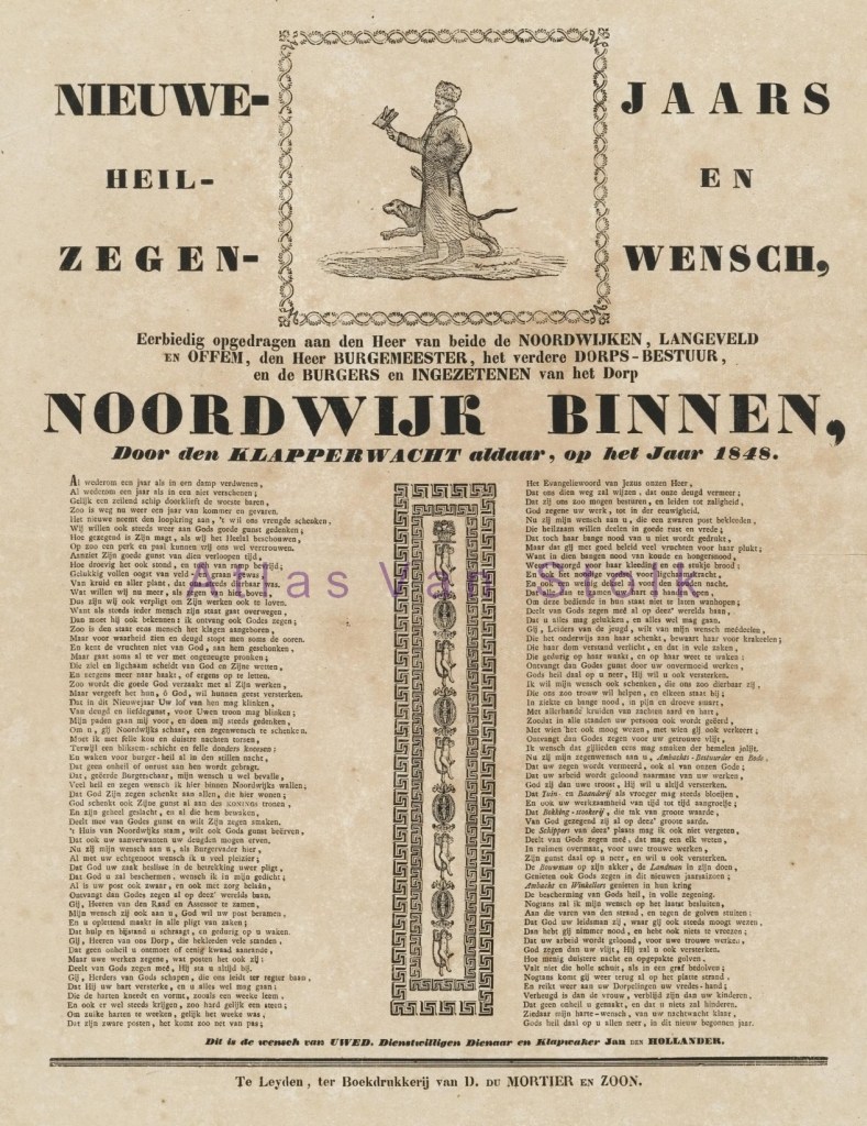 De ‘klapperwacht’ was in vroeger dagen een gezelschap van mannen die – betaald – een dorp ’s nachts in de gaten hielden op mogelijk onheil zoals bijvoorbeeld brand. Ook Noordwijk had blijkbaar een eigen ‘klapperwacht’, die in 1848 bovenstaande nieuwjaarswens publiceerde. Dergelijke gedrukte nieuwjaarswensen werden vervaardigd in opdracht van een bepaalde beroepsgroep of van openbaredienstverleners in een stad om langs de deuren te verkopen. De klapperwacht was niet de enige groepering die dit soort van nieuwjaarswensen publiceerde. Ook groepen als lantaarnopstekers, tamboers en courantbezorgers huldigden deze traditie. Je zou de nieuwjaarsprent het best kunnen zien als een chiquere voorganger van de hedendaagse kaartjes met wensen die de bezorgers van kranten en reclamedrukwerk rond de feestdagen overhandigen in de hoop op een fooi. Dit type prent werd al in de zestiende eeuw op de markt gebracht.