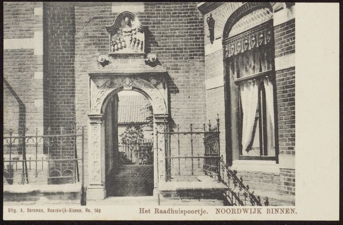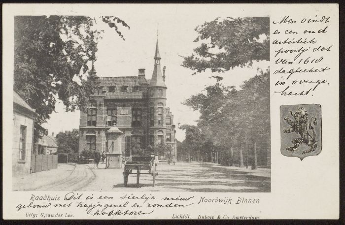 “Dit is een sierlijk nieuw gebouw met trapjesgevel en ronden hoektoren” staat er op de kaart geschreven. En ook: “Men vindt er een oud artistiek poortje dat van 1618 dagteekent is overgebracht (?).” Vooruit: het poortje dan maar ook: