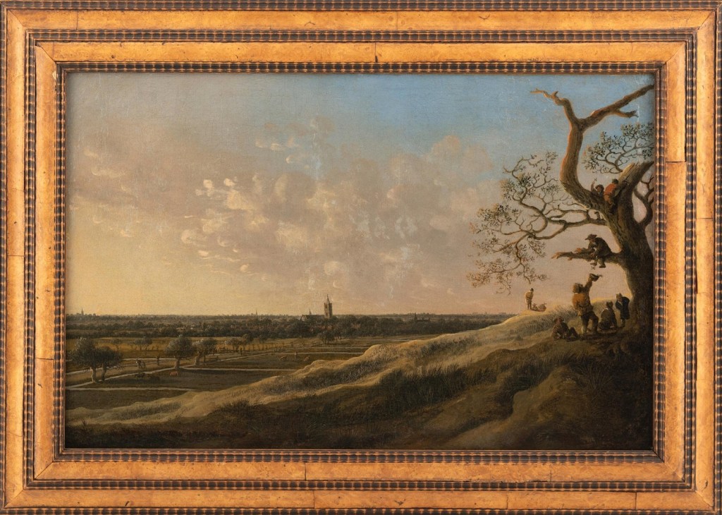 Maar goed. Hij was dus op enig moment – waarschijnlijk 1658 – ook in Noordwijk, waar hij dit schilderij maakte: “Hollands landschap met zicht op Noordwijk”. Het staat te koop op de veilingsite van ‘Invaluable’ met een inzet van € 8000. Ter toelichting wordt daarbij – in het Engels – nog het volgende opgemerkt: Ferdinand III Mülhens Collection, Cologne. Dutch Landscape with a View of Nordwijk, under this title the picture has found its way into the Mülhens collection. In front of this flat, summery landscape with a low sky, the main scene of the painting takes place at the far right edge – nest robbers. Seven peasant boys raid the birds’ nests hidden in an old withered oak tree. They sit and stand under and in the tree, climbing to the top branches…the quiet landscape in front of the church tower of Nordwijck just observes.