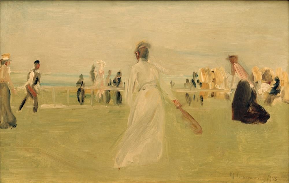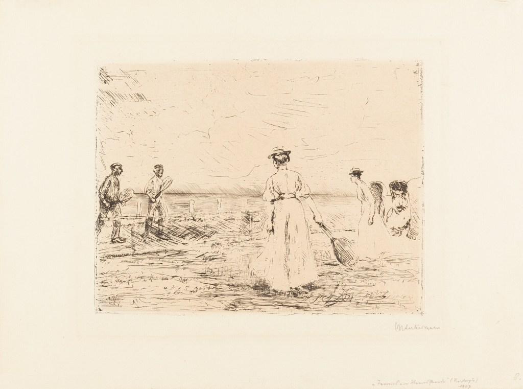 Ik dacht altijd dat bovenstaand schilderij van Max Liebermann in Scheveningen gesitueerd was: “Tennisspelers aan het Strand.” Nu kan dat nog steeds. Het is gedateerd op 1903, maar ik kom nu een mij onbekende ets tegen van diezelfde Liebermann van diezelfde tennisspelers, gemaakt in Noordwijk in 1907. Daar heet het nu “Tennis am Meeresstrand”. Maakte Liebermann een ets naar een eerder schilderij?