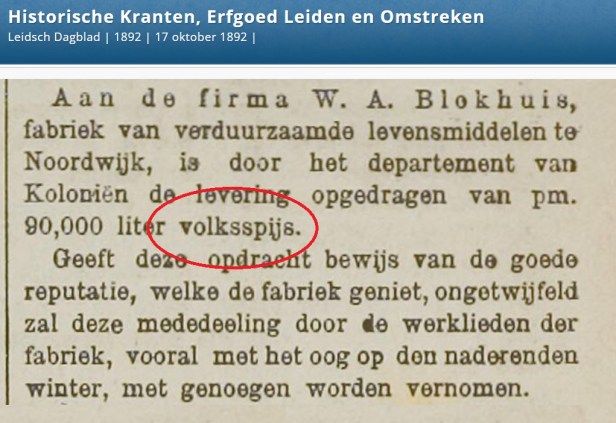“De Anna” was een fabriek voor verduurzaamde levensmiddelen, zeg maar: een conservenfabriek. Wouter Blokhuis had de fabriek opgericht en vernoemd naar zijn moeder. Lange tijd ging het goed, vooral dankzij de vele opdrachten die hij kreeg van het leger. Zo ook in oktober 1892, toen De Anna een bestelling ontving van het ministerie van Koloniën ten behoeve van het Koninklijk Nederlandsch Indisch Leger (KNIL): 90.000 liter volksspijs. Je zou vandaag de dag denken dat ‘spijs’ vooral een ingrediënt was krentenbrood of van banket- dan wel speculaasstaven. Maar in die dagen werd in Nederlandsch-Indië onder ‘volksspijs’ verstaan blikken met wortelen, uien en aardappelen, of met zuurkool en aardappelen, of met snijbonen en aardappelen. Of met boerenkool.