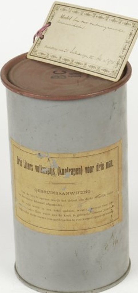 Hoe of dat zo’n blik met volksspijs er dan uitzag? Nou bijvoorbeeld zo (in dit geval knolrapen voor 3 man):