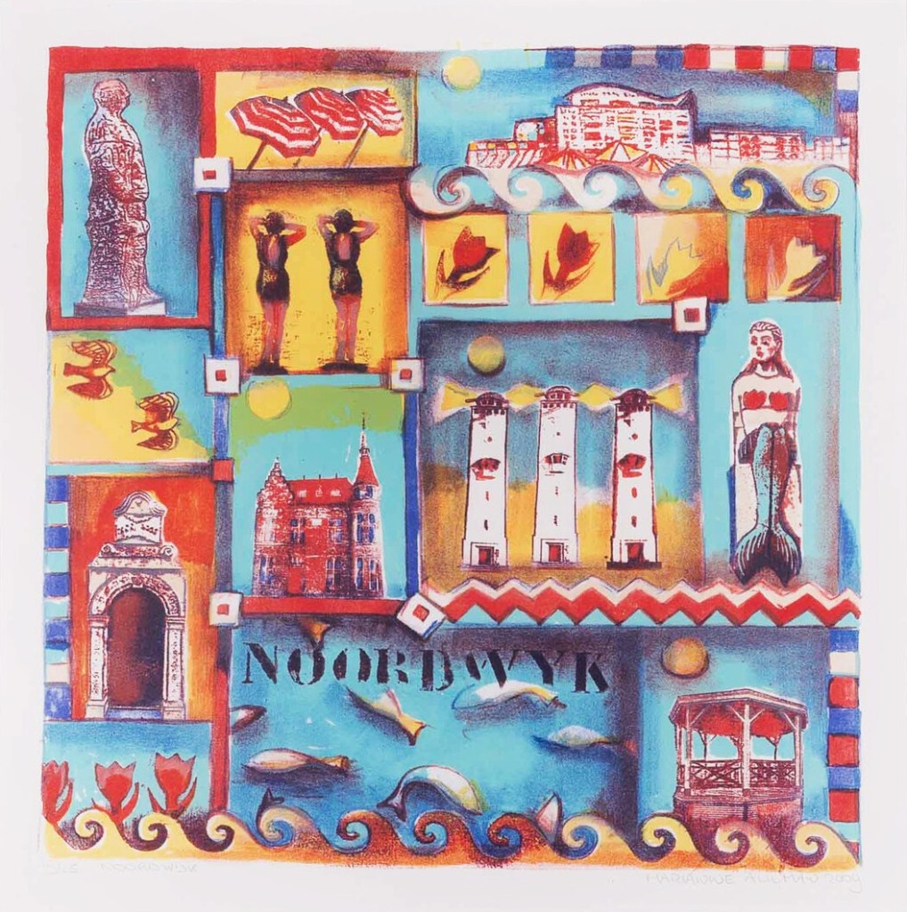 Eveneens op museumdepotshop.nl ruimhartig door de Gemeente Noordwijk aangeboden: Marianne Aulman, Noordwijk, 2009. Zeefdruk in houten lijst, gedrukt in een oplage van 25 ter gelegenheid van de Beeldenboulevard in Noordwijk in 2009. Kleurrijke compositie met diverse kenmerkende gebouwen en beelden van Noordwijk, zoals het gemeentehuis en Huis ter Duin. Linksonder oplagenummer en titel, rechtsonder signatuur en jaar. Meerdere oplagenummers beschikbaar.